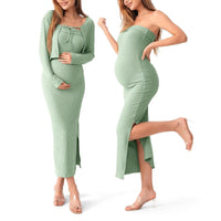 Stay chic and comfortable throughout your pregnancy with our 2-Piece Maternity Maxi Dress Set. Designed with expecting moms in mind, this beautiful ribbed-knit outfit combines stretch, softness, and timeless style — perfect for baby showers, photoshoots, or everyday elegance.
